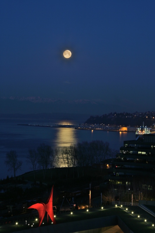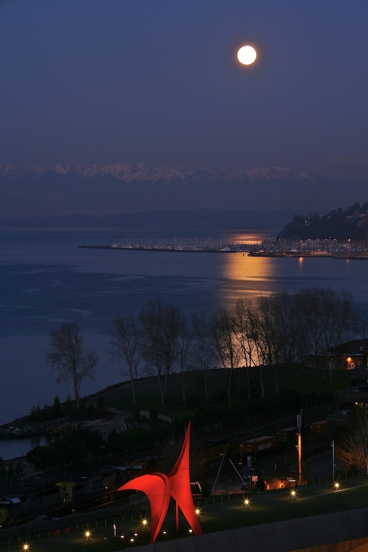 This shot is pretty good technically. Good depth of field, but then I set the camera to f/14 to get exactly that effect. While the moon is "blown out", that is generally to be expected. The baseline moon is about 1/125 at f/5.6 plus or minus a bit. The balance of the scene meters at 15 SECONDS at f/14. Hmm that must be about 15 stops of dynamic range, so something has to give. I elected to get the background rather than the moon. But, there were other factors that I did not consider. Notice the trails? These were aircraft on departure or approach to SeaTac airport. The pulses are their navigation lights. These were not on the menu, but it made an interesting side dish. Also, the very long exposure totally blurred out the wave action on the bay. But, to the camera's extreme credit, there is minimal ISO and exposure noise. Note the exposure of the passage under the bridge and "The Eagle" sculpture. And note the stars in the sky and clouds. Very impressive. Lesson: think about things that could appear in the scene before they happen and look for them before they happen.