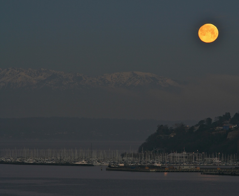 On most topics, I consider myself to be "trainable". That is a good thing, otherwise I would have have committed some unspeakable act(s) due to frustration. Taking shots of the moon, at night, with other lights nearby is quite difficult. Recently, we had several nights of remarkably clear weather (for Seattle). On the first day, I got out of bed a bit late. When I walked into the living room, I saw a great view of the moonlight reflecting off Elliot Bay. Recognizing the opportunity, realizing that these scenes last only moments I sprung into action. Gladly, my equipment was close, so I hustled to set up the tripod and camera on the balcony. If you note the date on this post, you will realize this was during the dead of winter. Knowing that time was short, I attempted to take shortcuts to get setup while the scene was at its peak. Forsaking shoes and a coat, I had the kit assembled and began shooting.