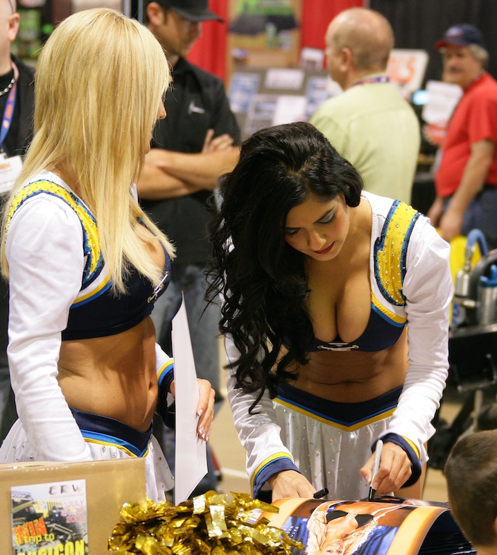 Speaking of bumps, several of the "Charger Girls" were working one of the booths. Needless to say, they were getting tons of attention from the mostly-male crowd. Look at the smile of that fellow in the rear. The blonde "gets" working a crowd, the other one less so.