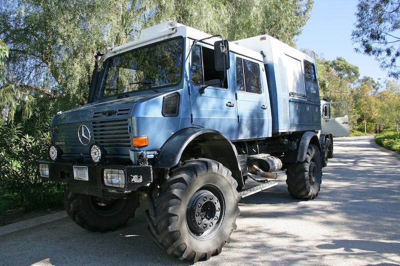 To provide a sense of scale, that is a normal height person at the left. I am guessing that this rig is at least 2 feet taller than my truck, excluding the A/C box on the roof. My 1300 is in the back and you can see both the camper and the roof rack.