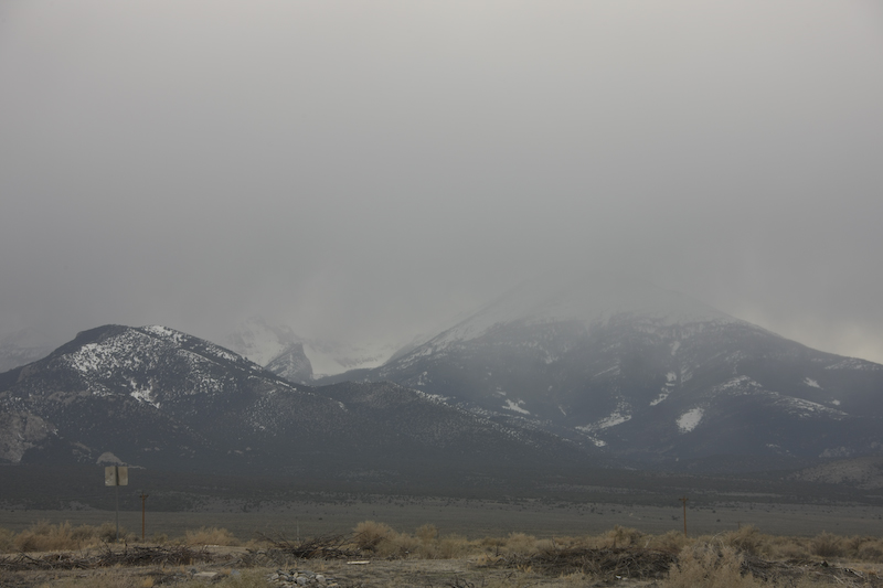 We went into the tiny town of Baker, NV and then went to the GBNP visitor center to get intelligence on places to stay for the night. The campgrounds in the park were over 7500 feet, and would therefore be much colder and likely to get snow that night due to the oncoming storm. In the end, we elected to find an open area south of town and camp there. The wind was starting to pick up and the clouds were building. Above, Wheeler Peak can be seen as the dominant feature on the western skyline.