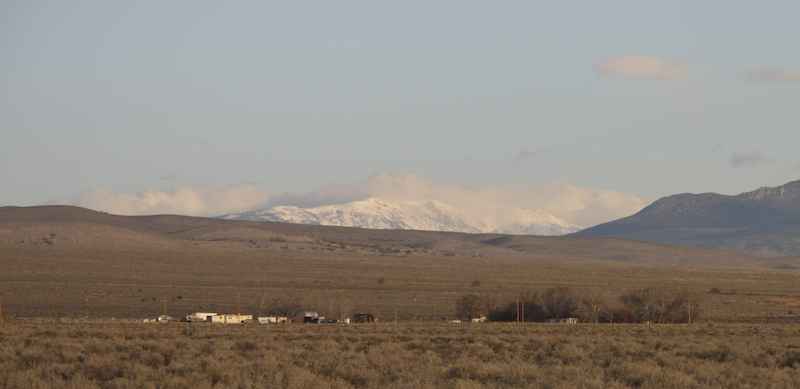 As we left the park, the weather degraded and the winds picked up. It snowed a bit coming over Sacramento Pass and again as we hit Hwy 93. Here is the Wheeler Peak range as seen from the western side. Note that the peak is no longer visible due to the weather.