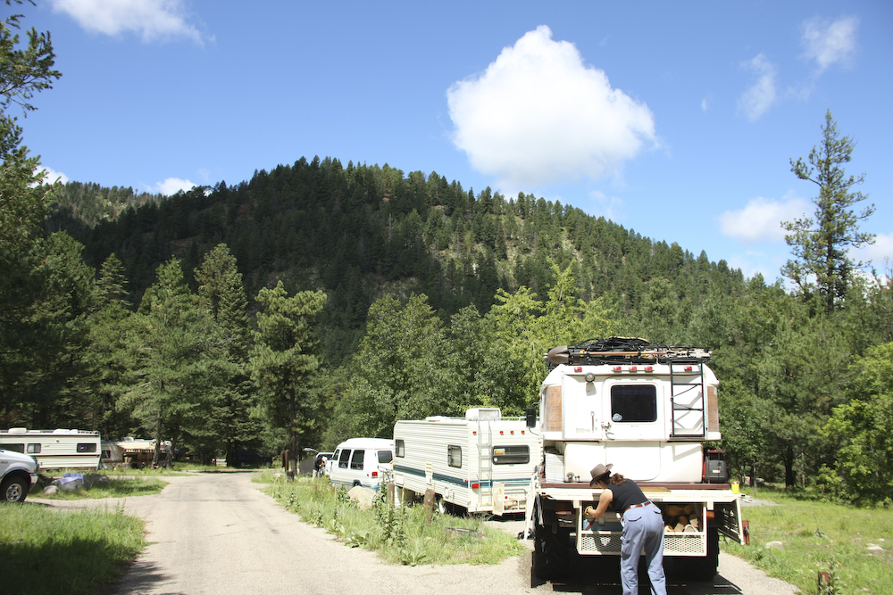 When we left Three Rivers, we decided to head up to Alto, NM. The plan was to get a camp at the local RV place that would allow an internet connection and posting of photos. The place was mostly full and it did not have the flavor I wanted, so we headed for the hills. Since we had been out so long, I lost track of what day it was. Sadly, it was Saturday and the area we were in was very popular with the Texans. In the end, we got nearly the last place in the camp, but it worked out OK. Above, Kathleen grabs a beer in preparation for raising the top of the camper. That night, I made fried chicken in the camper and it was awesome. Time consuming, but great. And it rained. And rained. And rained. All night it rained and into the dawn hours. The rain stopped before we planned to leave and no damage was done.
