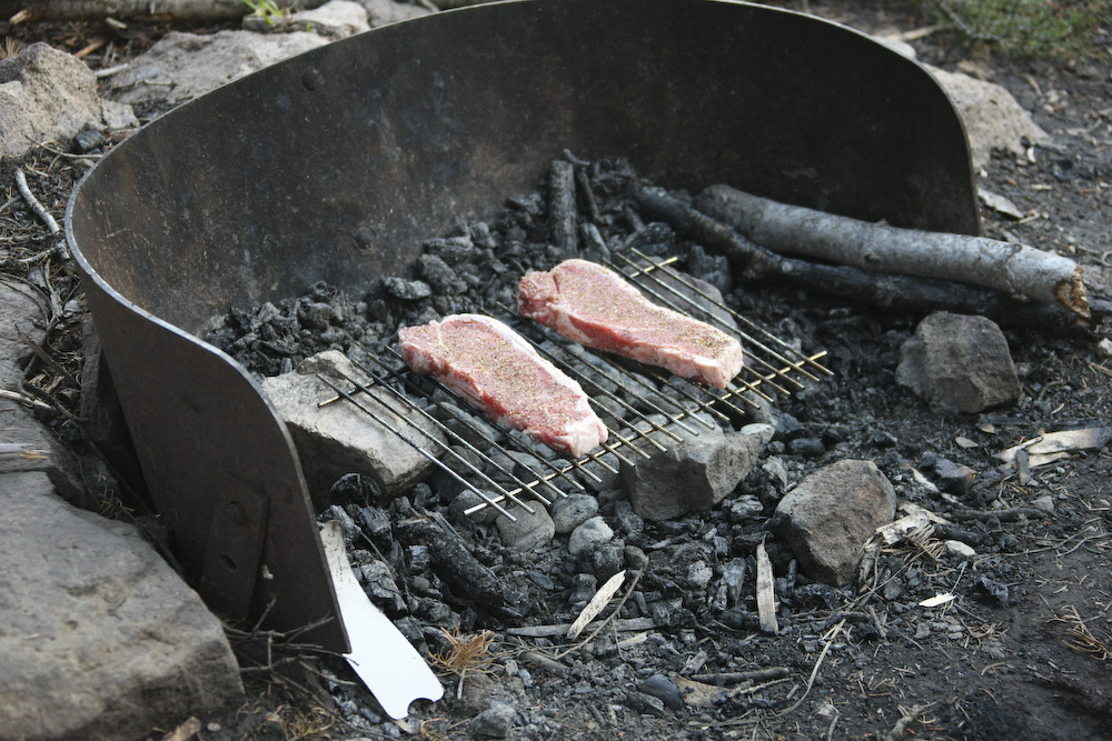 Nothing like a little "dead red" to make the camping experience complete. The steaks looked better than they were; they were rather tough. We bought them at the general store in Pecos and they were likely from local beef.