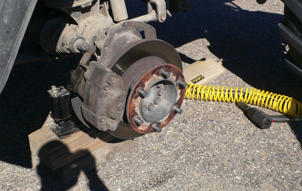 The brake caliper assembly was supported by baling wire to prevent kinking of the lines when the assembly is unbolted from the hub. The bottom bolt was a zero clearance bolt and was really, REALLY hard to get out.