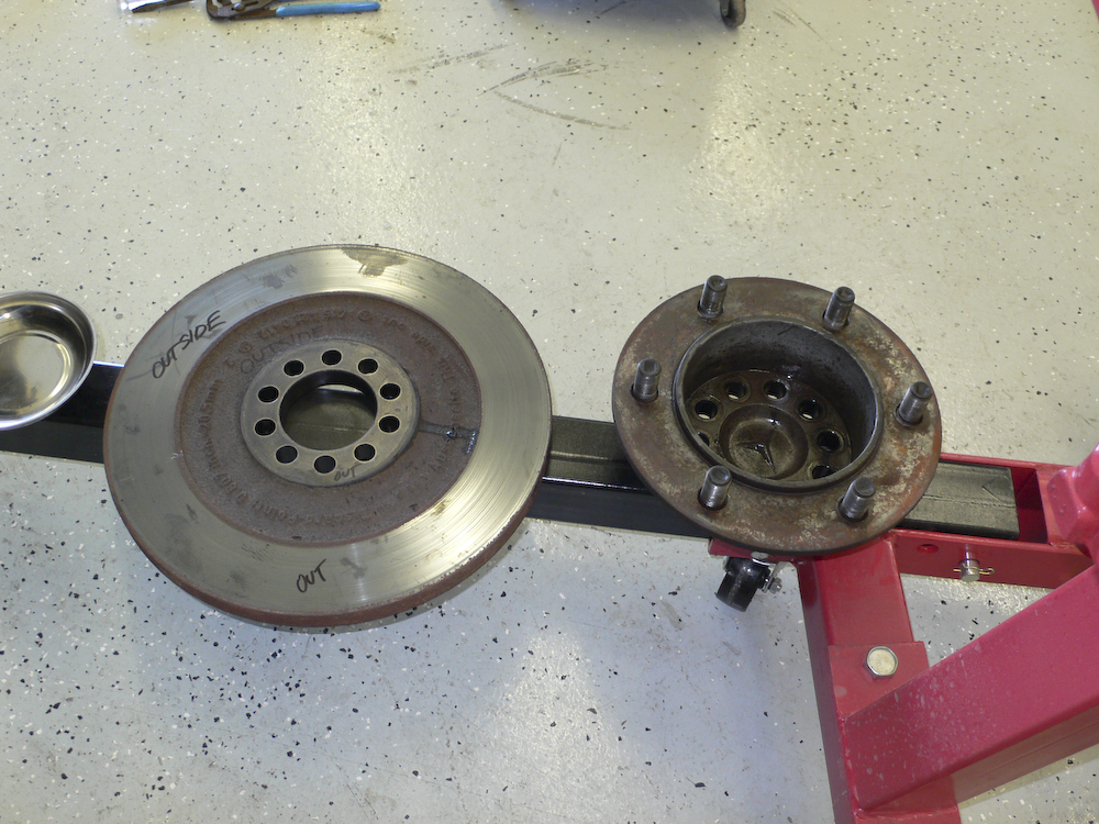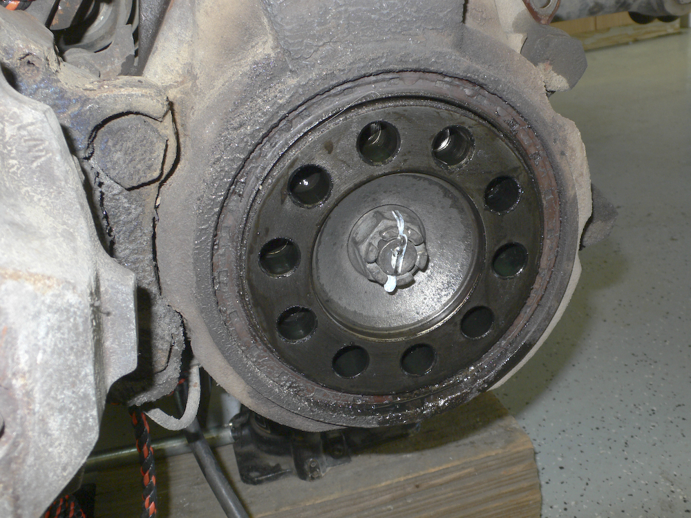 Next, the wheel mount and brake disc was removed. This assembly is heavy, so I used the engine hoist and some rope to insure I did not get a painful surprise on my foot.