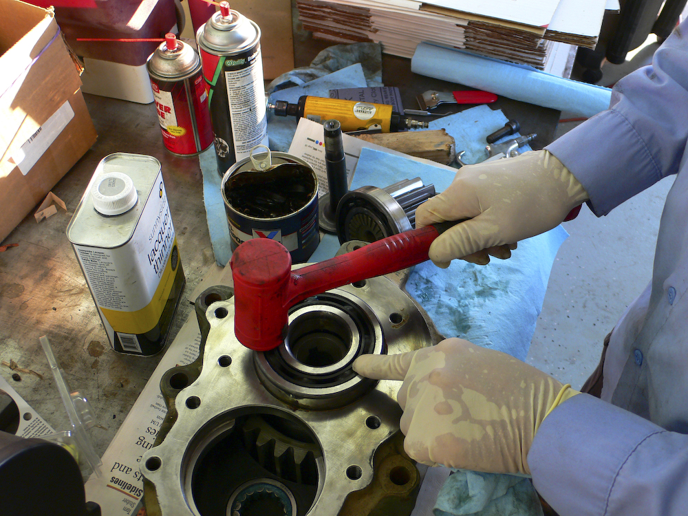 Greasing needle bearing for driver gear prior to installation into case.