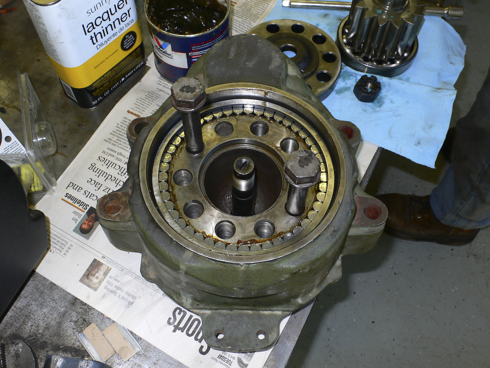 The bad news. Upon cleaning and subsequent inspection, I discovered that the large bearing on the wheel gear had fused to the gear and the bearing had spun inside the casting wearing a deep grove in the casting and rendering it scrap. The shiny surface above should be smooth and flat, but now it has a groove and a lip. Rob was able to find an appropriate casting and sent it overnight as well.
