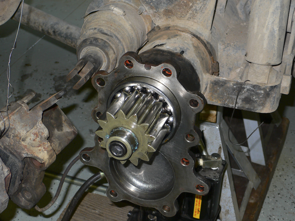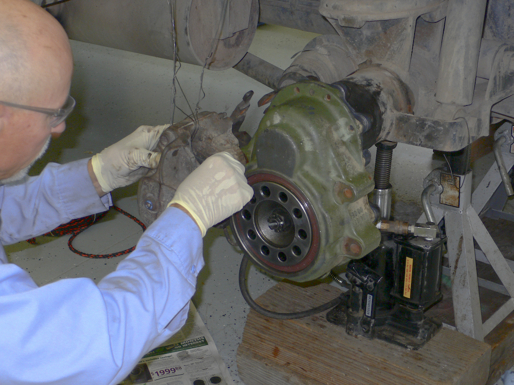 The hub assembly was hoisted to the assembly using an engine hoist. The assembly is heavy and was somewhat difficult to mate correctly. Patience and a rubber mallet won in the end.