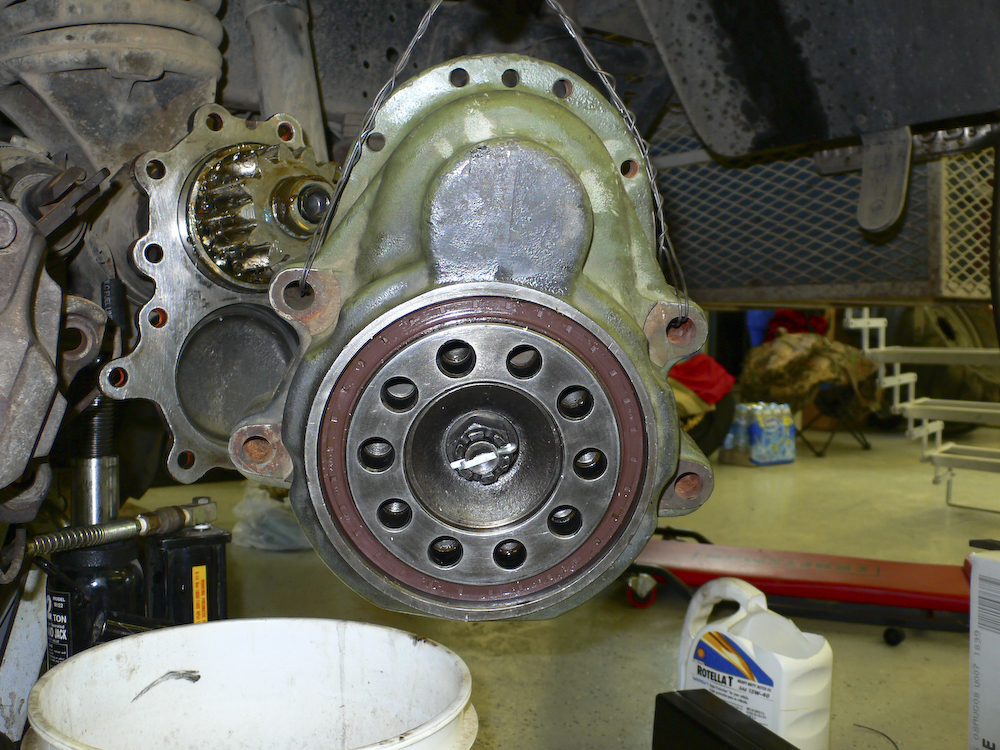 Axle-gear combo installed in axle housing. The bearing has been tapped into the housing, holding the combo in place for the next step.