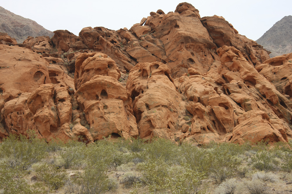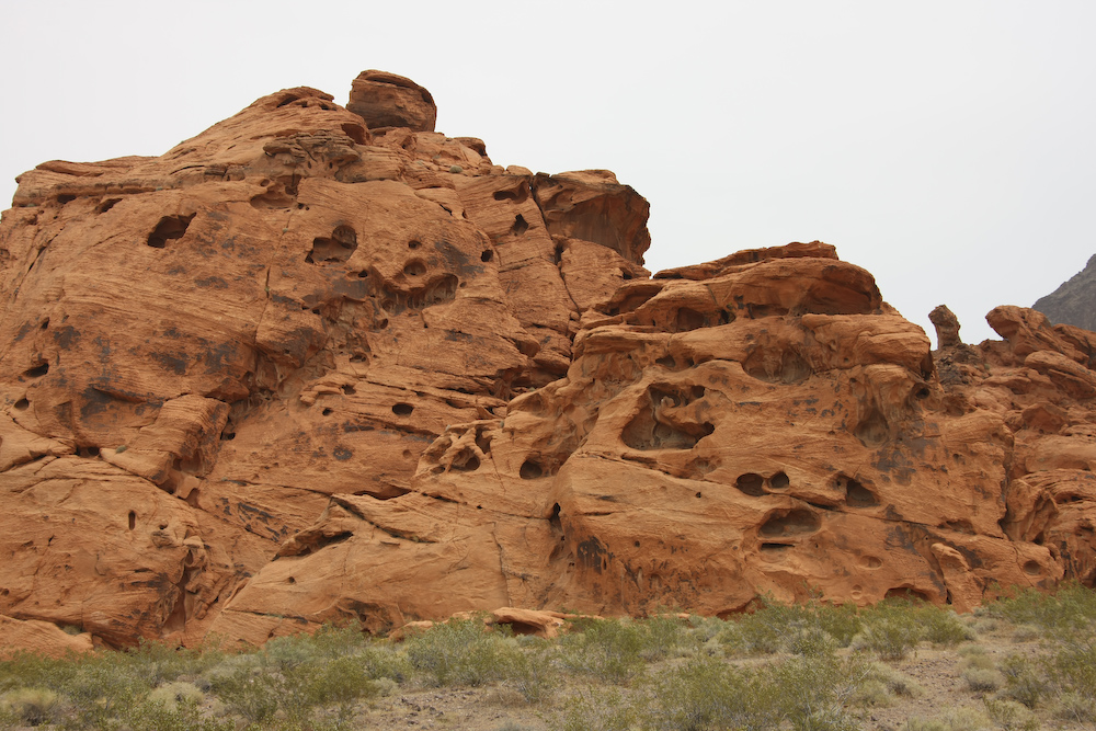 Further north, near Valley of Fire, sandstone outcroppings started to appear. The wind and sand erode the rock into interesting patterns.