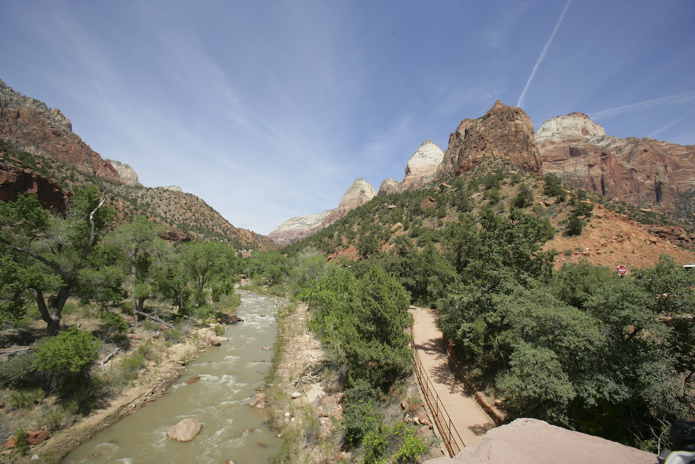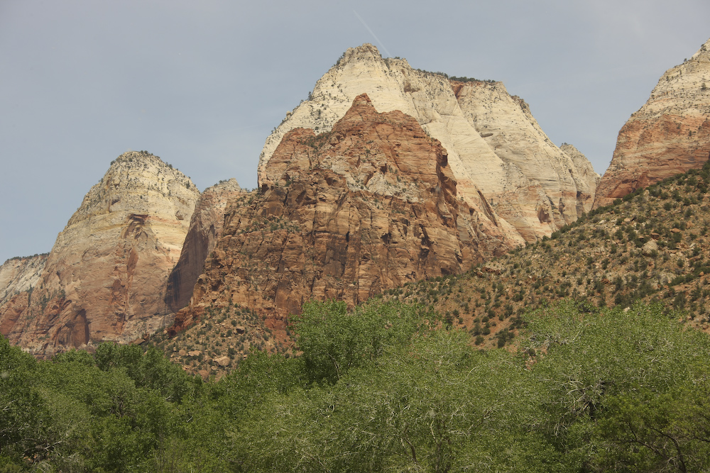 The west entrance to Zion park is bounded by large cliffs along the Virgin River. Nearly every structure in Zion has a name. Based on my somewhat sketchy map reading skills, I think the structure on the right is "Johnson Mountain" and the one on the left is "the Watchman".