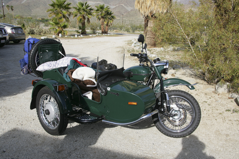 Recently, my buddy Kai purchased this Ural motorcycle with a side car. The cycle is a Russian copy of an old BMW design. The cycle has 2WD available via a dog clutch that can be actuated by the rider. This gives this bike surprising off-road capabilities which Kai would prove over the next 2 days. Kai and his son Parker rode the cycle from San Diego to Borrego early in the morning. Needless to say, they were a bit chilled when they arrived.