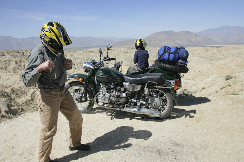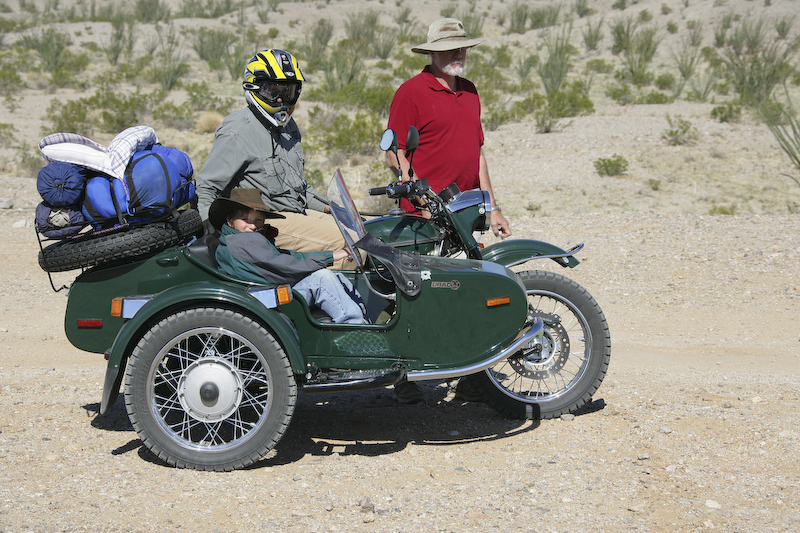 Kai and Parker take a break in the Ural on the way to Hawk Canyon.
