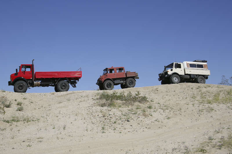 Break time on the ridge. Unimogs from left to right: 2450L, 406 DOKA and 1300L.