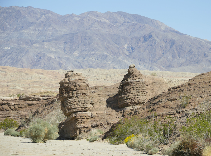 Twin hoodoos with the badlands in the distance. When we finished in the desert, we returned to Borrego Springs to fuel up for the trip home. Diesel was $4.15 a gallon, a new record.