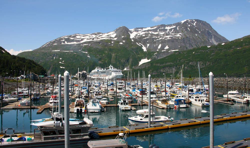 The small boat harbor at Whittier. The Island Princess is visible in the distance.