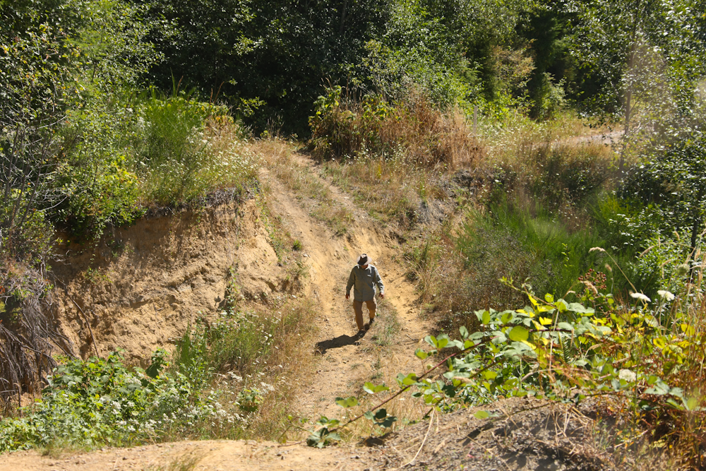There I was, traveling along and minding my own business and the road had the nerve to be washed out. The road was single lane pavement right up until it was not there. We had traveled many miles south from Alsea on a one lane, twisty-turney road so back-tracking was not that appealing. So, I scoped it out to see if we could cross the obstacle. We had not seen a car all day, so caution was the order of the day. Above, I return from inspecting the far face of the wash-out. Note the height of the embankment behind me; and I am not to the bottom of the wash-out yet!