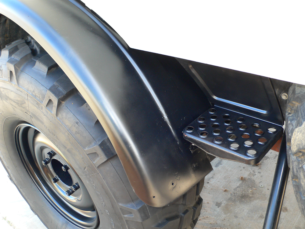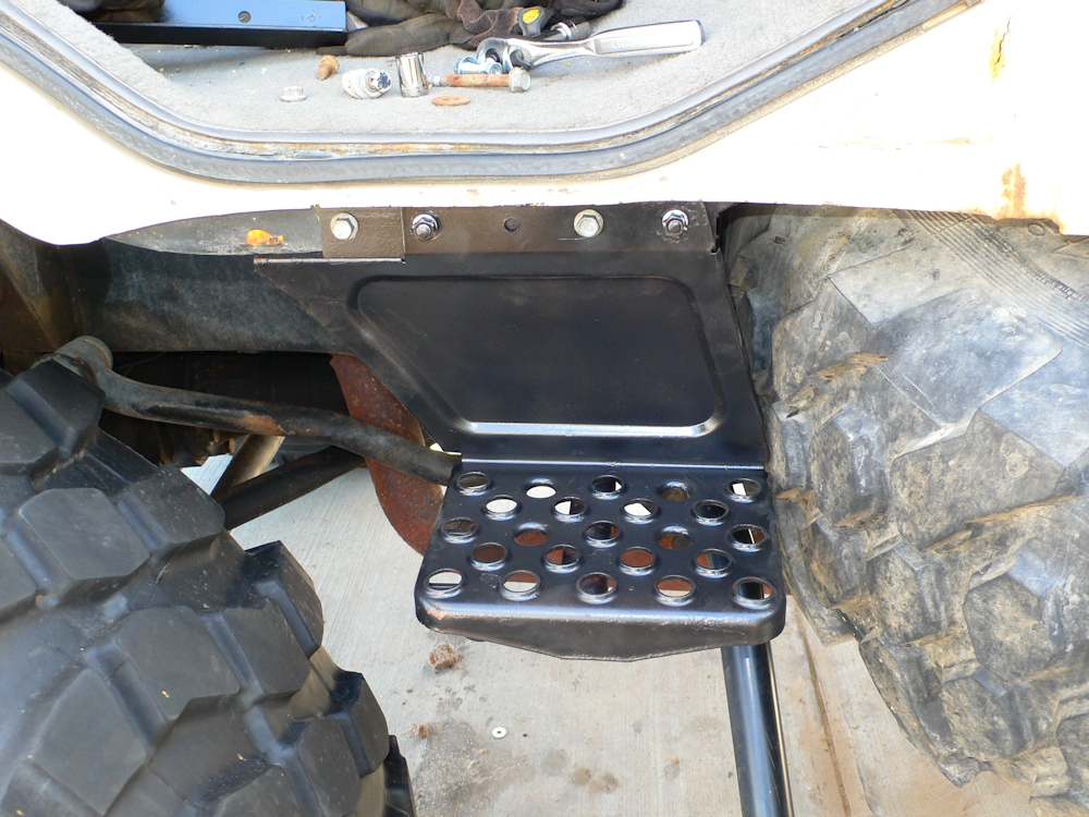 The top step is mounted on the cab. Note that the bracket allowed movement of the step to the rear by about 2". The good news is that it was not that hard to make. The bad news is that there is now an interference with the spare tire that will require removal of the step if I have a flat.