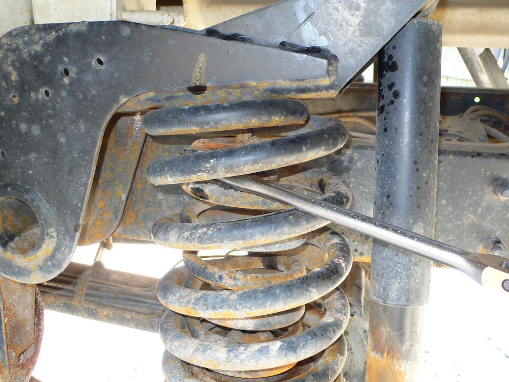 In principle, the task seemed easy enough: raise the frame of the truck (not THAT easy when the rig is 14,000 pounds), and undo the coil spring retaining bolts. Then, the puck and puck plates are installed along with longer bolts. Then, the shock extension brackets are installed. Sadly, this was not sufficient to prevent the tires from rubbing on the fender. My email exchanges with Pete told me that I also had to move the front fender and top step to fully complete the job.