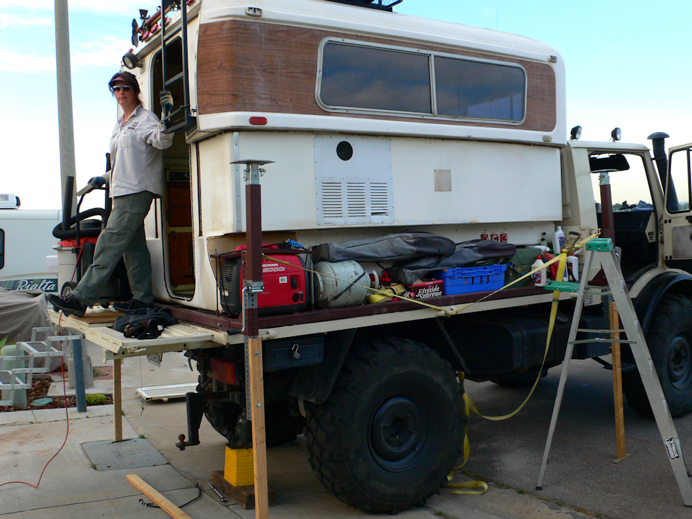 It works: we lowered it, and then raised it again. No leaks visible (yet) so wish us luck. We still have to replace the hinges on the doors and hang them on the camper shell.