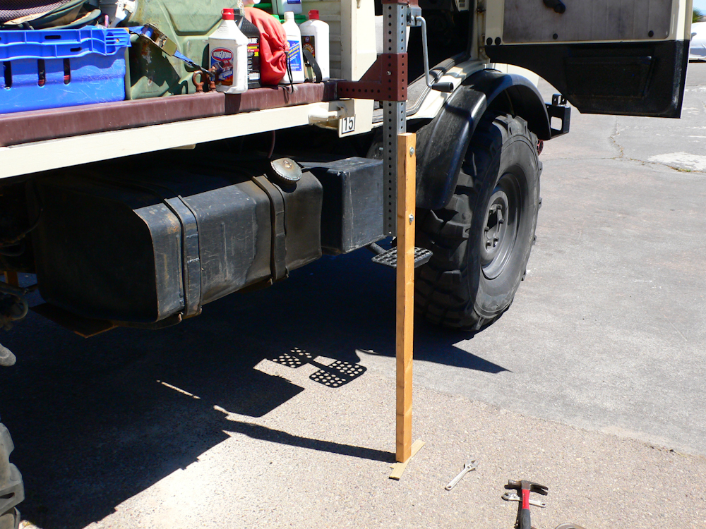 First, we have to stabilize the body of the truck from rolling under our weight. Since the camper top will be suspended above its normal position by about a foot, "roll control" will be critical. To achieve this, I got some long 3/8 bolts and took some spare timber and sliced it to the appropriate length. Then, holes were drilled that allowed bolting the timber to the descending part of the jack assembly. Finally, shims were inserted under the brace to insure that the springs were partially unloaded and the brace, rather than the springs in the suspension, would take the load first.