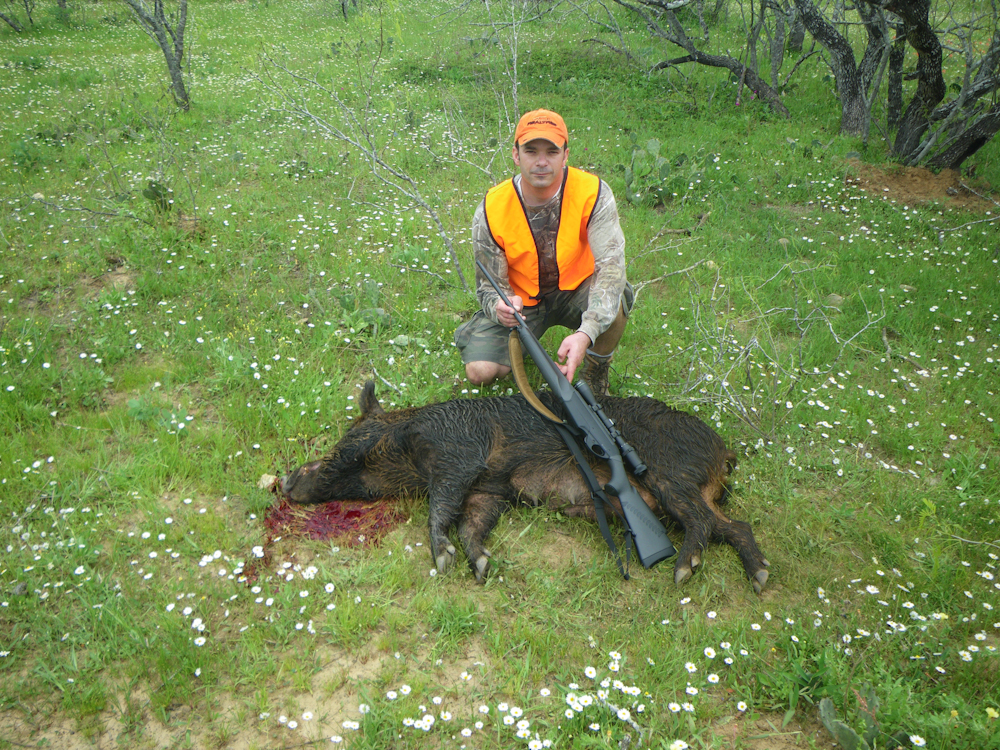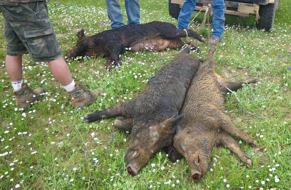 Several of our hunting partners who had been using shotguns with rifled slugs the day before switched to high-powered center fire rifles for the day's hunt.  The hog above was shot with a .22/250 and one shot literally blew the hog's head "clean off".  A one-shot clean kill.