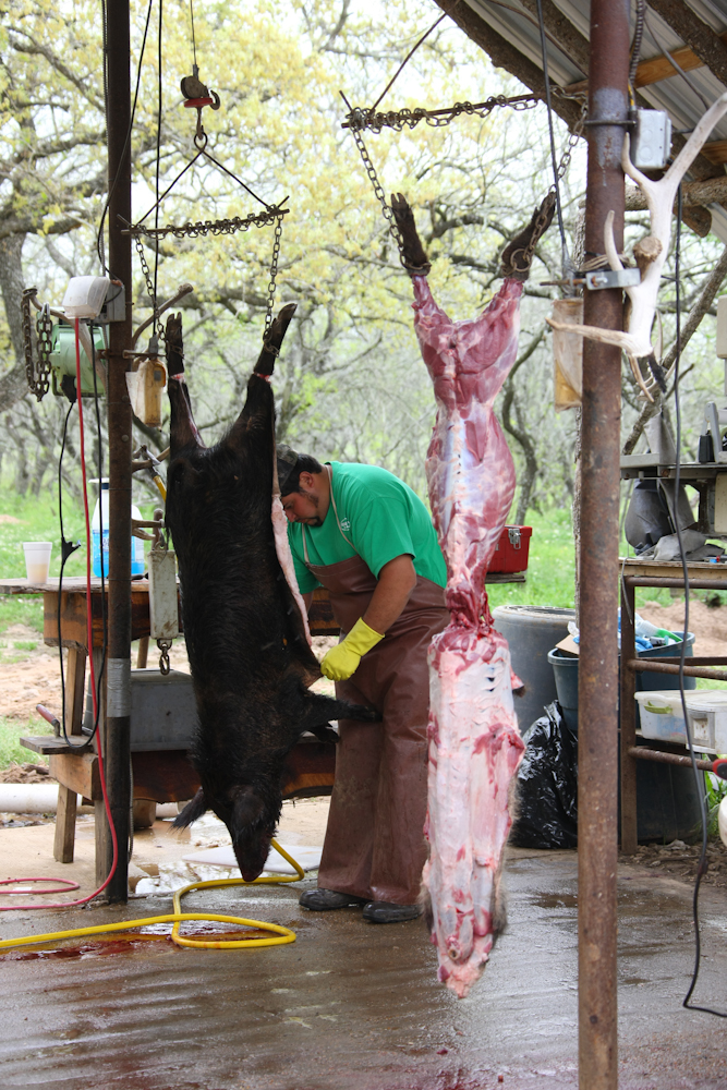 The butchers were working hard.  I think that there were 22 hogs taken that day.  The ranch does about 2300 hogs per year, on average.