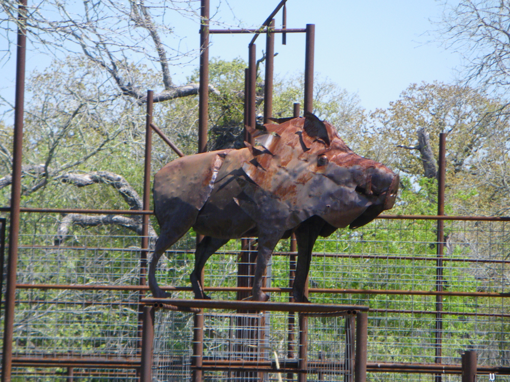 The gate at the hunt site had a large steel hog on top of some holding pens.  The owner of the site traps hogs on surrounding ranches (for a fee) and then brings them to his ranch and allows them to be hunted (for another fee).  Then, if you actually shoot a hog, you pay a fee to have it butchered and frozen.  An interesting business model.