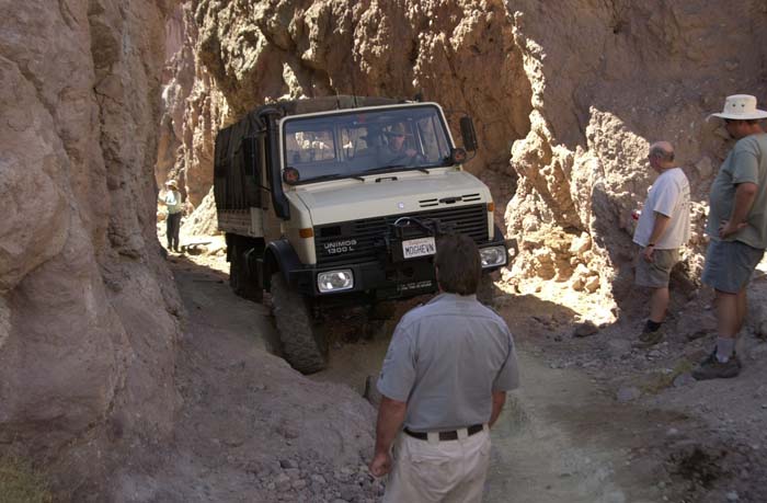 in Borrego, Kathleen pilots the 1300 through a narrow canyon.