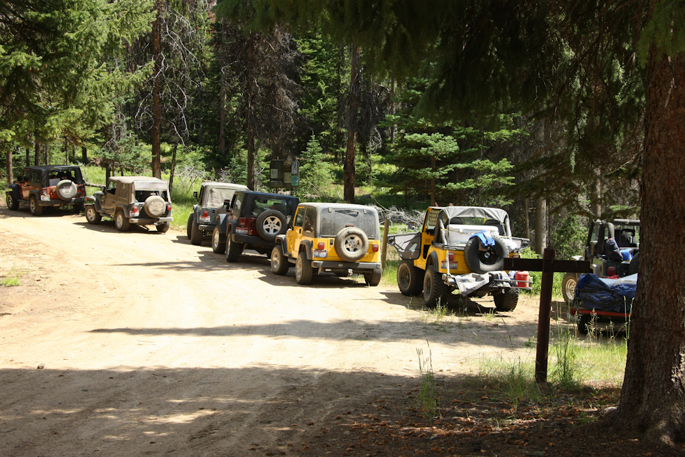 Next morning, we headed to the west on forest road 468 AKA Nez Perce Road.  I chose that route because it appeared to cross most of the northern portion of the state as a dirt trail.  It seems that the local Jeep club chose the road for the same reason.  We passed them oncoming while we were stopped for lunch.  That was good because the road was one lane only and the opportunities for getting past oncoming traffic were few and far between.  The jeepers were in awe of the 1017 and they all had to come over and take photos.  I was less in awe of their jeeps and this was the only photo I took of them.