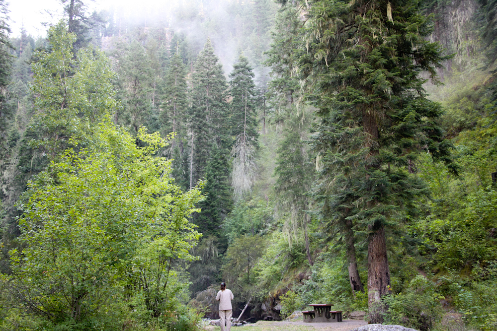 We elected to stop before we hit Grangeville and made camp at a road-side spot next to the confluence a small side creek and the south fork of the Clearwater River.  In the photo above, Katheen looks at the DUST in the distance with concern.  We were in the camper having coffee and we heard a noise that was loud, deep, percussive and extended.  Not knowing what it was, we went outside to investigate.  There had been a rock fall on the side of the steep cliff next to the camp.  Quite scary, but by the time that we got outside to look, only dust remained.
