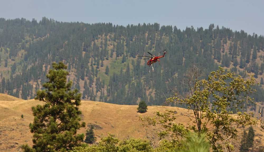 Near our intended camp for the night, we spotted this sky crane helicopter with dangling snorkel.  He was headed to a nearby fire after filling his on-board tank in the river via the snorkel.