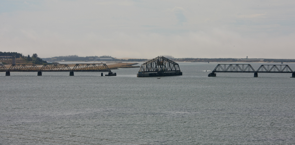 The railroad bridge was open to allow ship traffic to pass.