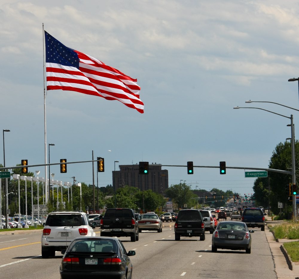 From Capulin, we traveled to La Junta, CO to visit friends and do some needed maintenance actions on the truck.  We have had a mushy clutch pedal for months and my repair kit was sent to Rob.  The installation was easy and after a bleeding of the air in the line, the clutch works as it should.  Along the way, we also repaired a tire that had a slow leak due to creosote we hit in Baja on our last trip.  Additionally, we adjusted the brakes and rotated the tires.  After several days with our hosts, Rob and Erin, we headed to visit another mogger, Jay, in east Denver.  Along the way, we spotted this huge flag waving in the strong breeze.  We suffered very high winds earlier in the day east of Denver, but the winds generally died down by the time we hit town.