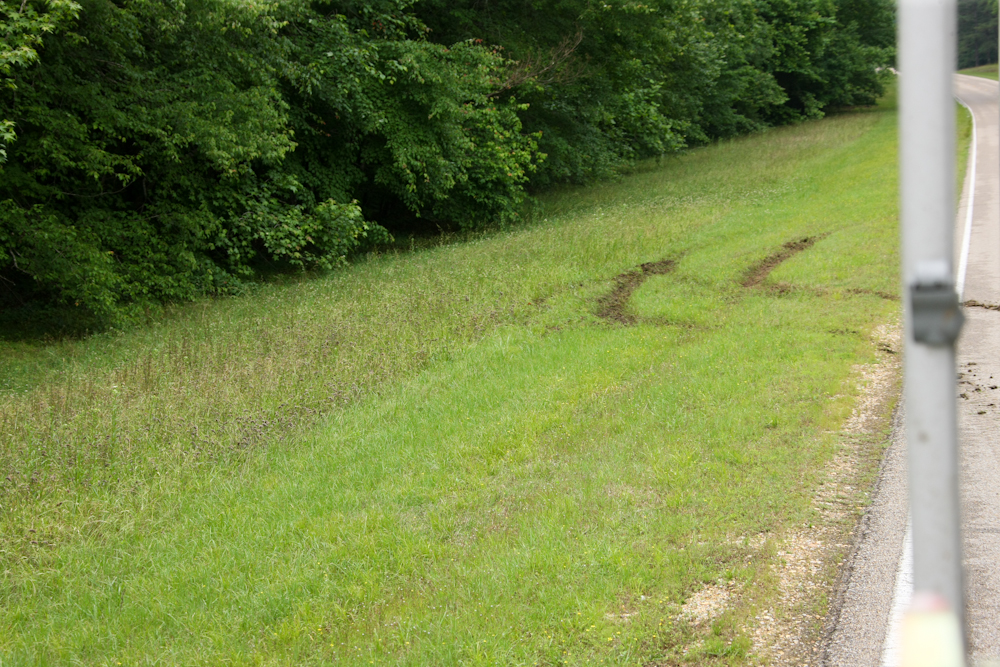 We could not get a view of the locks on the canal from the turn-out, so we re-crossed the bridge to get a photo. After a photo or two, we had to turn around. As part of the turn, we got our rear wheels off the road. The previous night's rain left the ground saturated and soft. We were spinning the wheels like crazy when we hit the clay-based mud. We left some pretty good ruts as part of our passage.