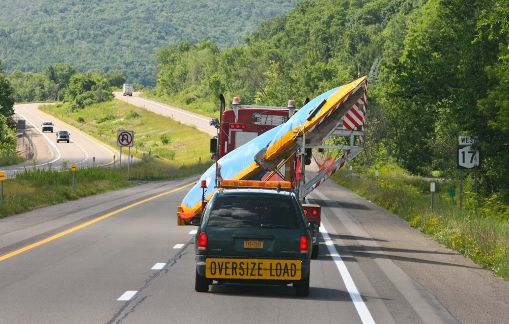 Sometimes interesting things pass you on the road.  This odd object is a rear stabilizer for a large aircraft and despite the custom mounting fixture, it still takes a lane and a half.  Note the overhang on the right side of the trailer.