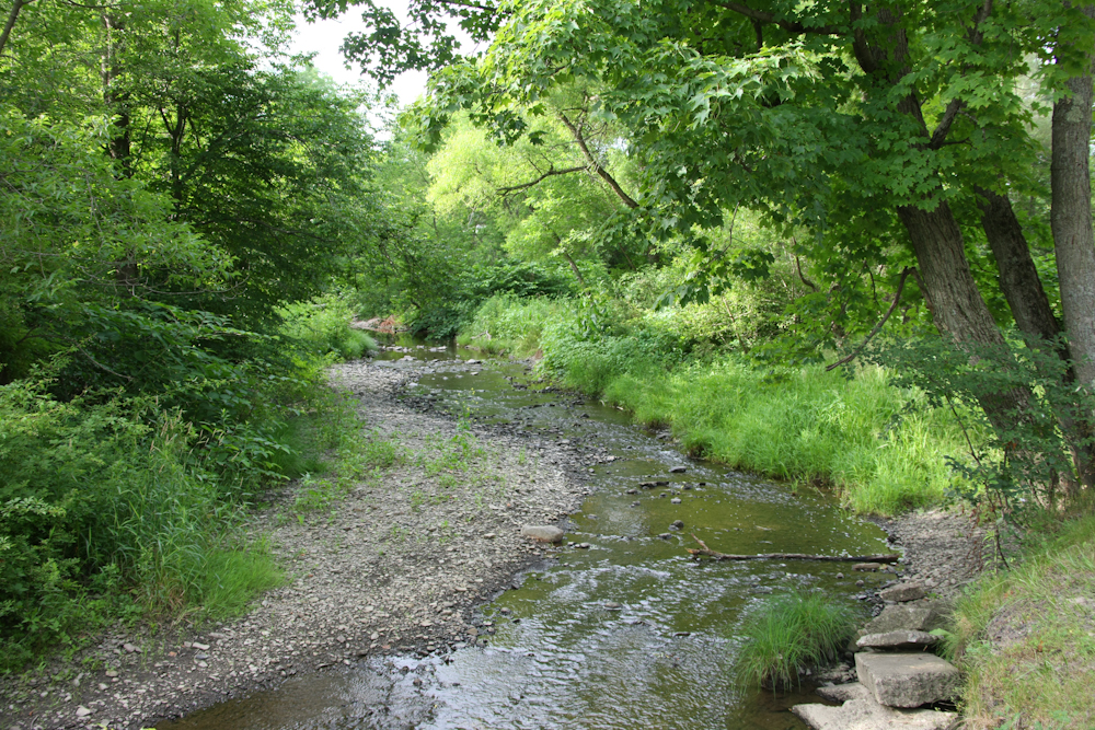 We found a nice camping area just north of Corning, NY (same as the glassware).  Our site had the only stream view.