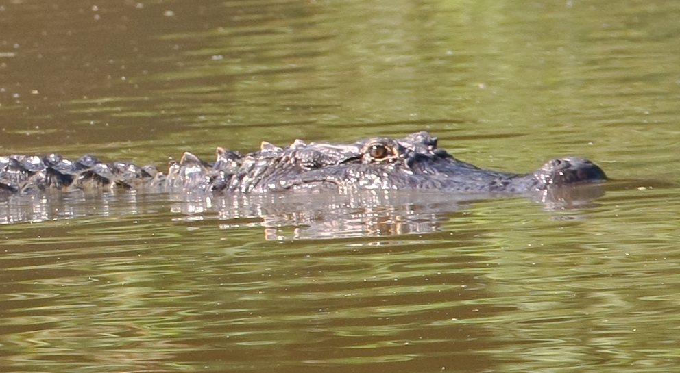 Next morning, Kathleen shot a few photos of the huge gator in the bayou behind our camp.  The lore states that every inch of length between eyes and nose translates into a foot of overall body length.  This is a big gator.