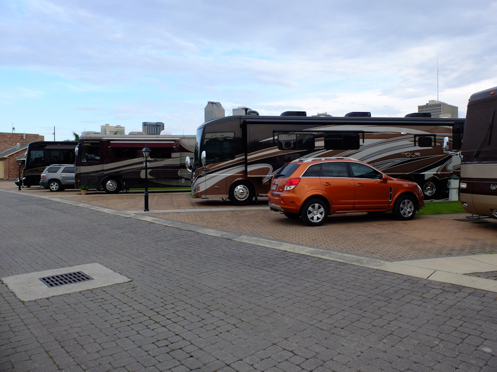 We stayed at the French Quarter RV park and it is one of the nicest places we have ever stayed in our truck.  It is only a short walk from the FQ, but it is in a seedy portion of town.  The only downside was we also had a nice view of the I-10 causeway and were in direct line of sight of the traffic and it's noise.  I-10 is visible in the top of the photo above.