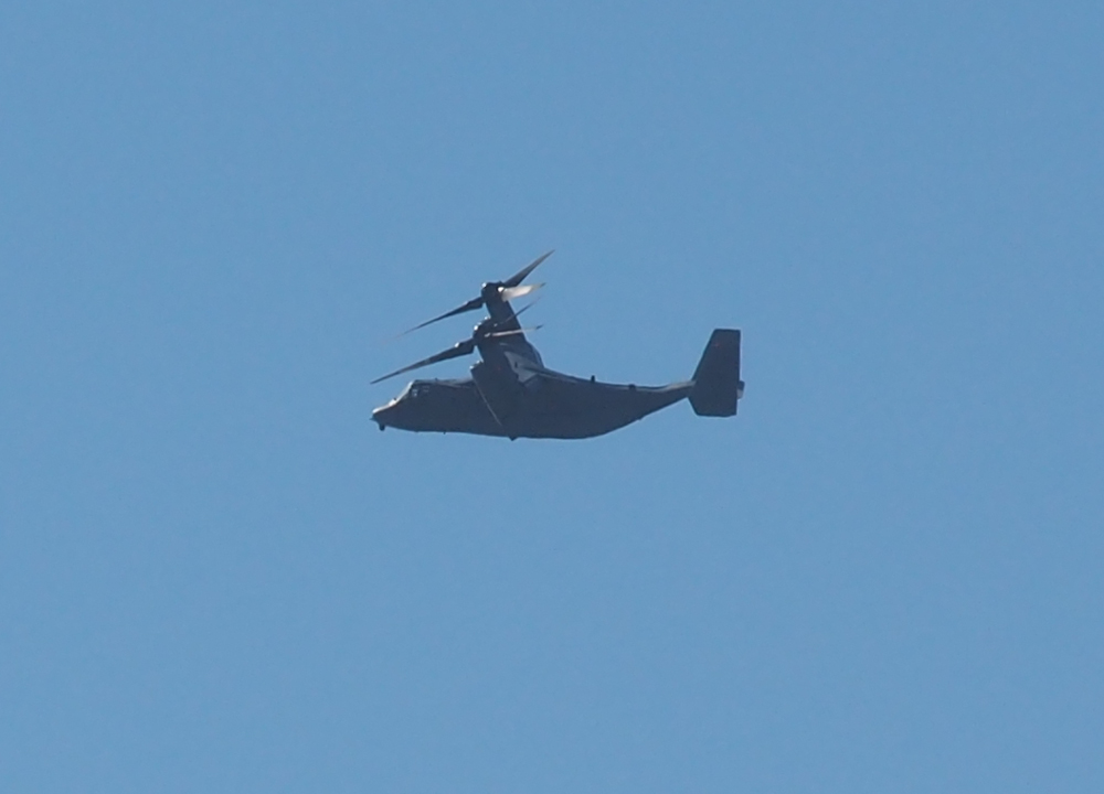 Because we were on the flight path for MCAS Miramar, we had multiple fly-overs, this one was a CH-53 or whatever the Marines call it these days.  Note the outboard fuel tanks, refueling spear on the front and the IR camera on the front spar.