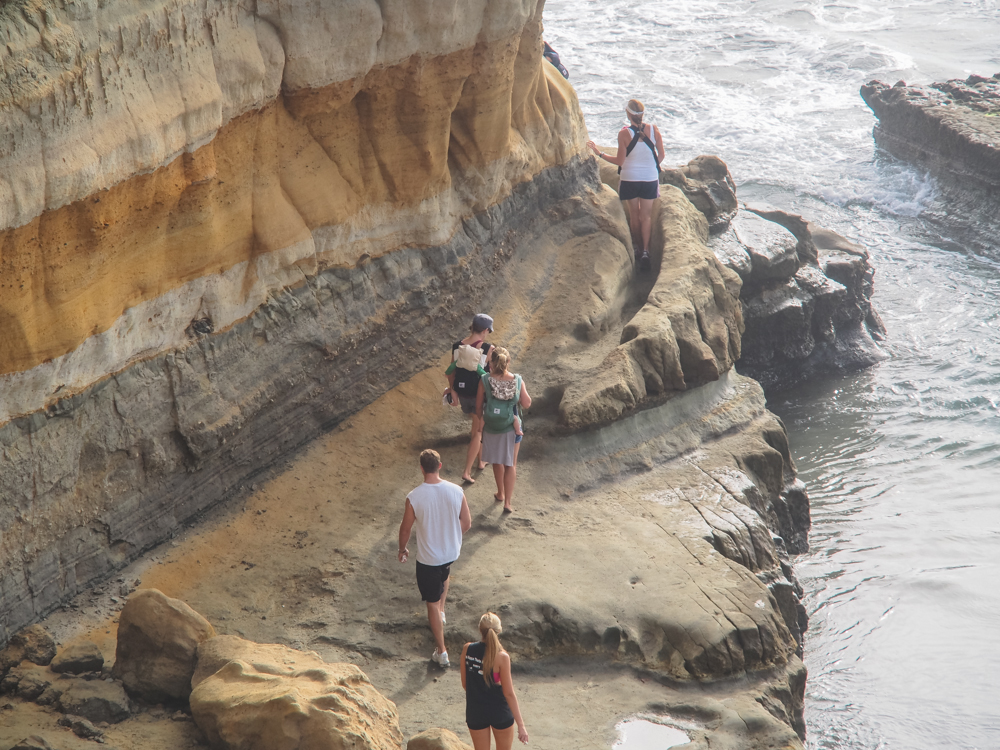 To the south, the path along the beach actually went onto the cliff.  Note the trench that the gal is walking in.  This trough was worn by the action of hikers on the rocks.