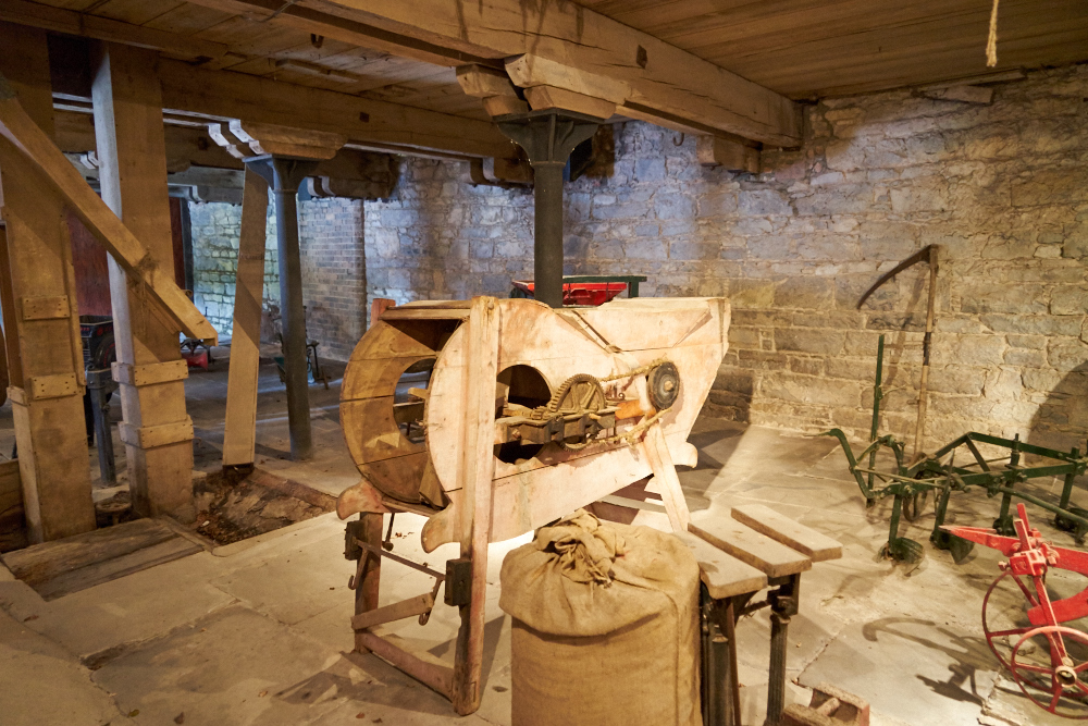An old belt-powered piece of farm equipment.