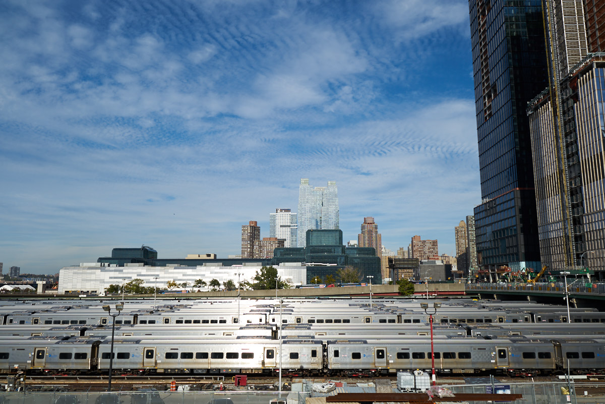 Also visible are Hudson Yards where the LIRR rolling stock is