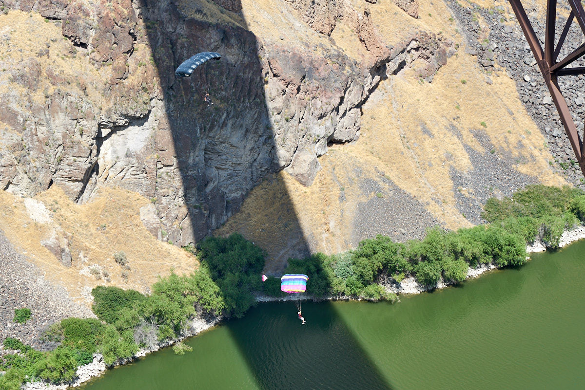 Look, there is a jumper!  We had heard that base jumping was allowed off the bridge.  Sure enough, there a set of guys with parachutes getting ready to jump.