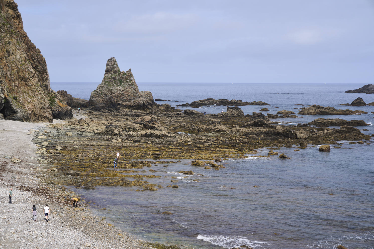 tide has exposed a large rocky area in the tidal zone.