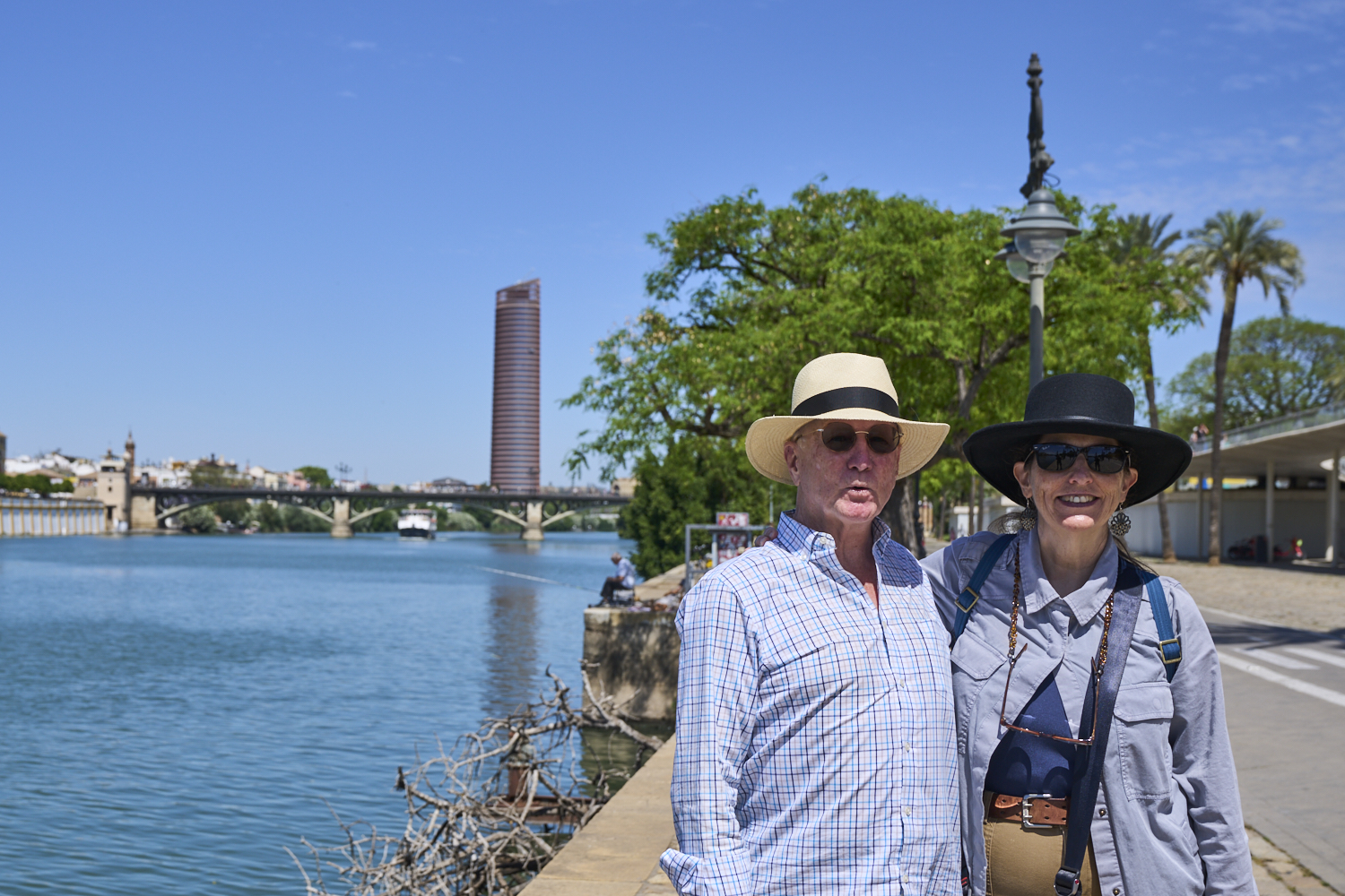 We inverted part of our trip in that we had to taxi from Gibraltar to the border, walk across the border, and then get a taxi to the Algeciras train station. From Algeciras we got the "slow train" to Seville. The trip shot a whole day, but it was reasonably comfortable except for the last, very slow leg. We got into the Santa Justa station and then got a short taxi ride to our hotel near the "center of the action" along the Guadalquivir River at the Triana Bridge. We stayed at the Bequer Hotel, which was very nice. We stayed at this hotel on one of our previous trips to Seville.